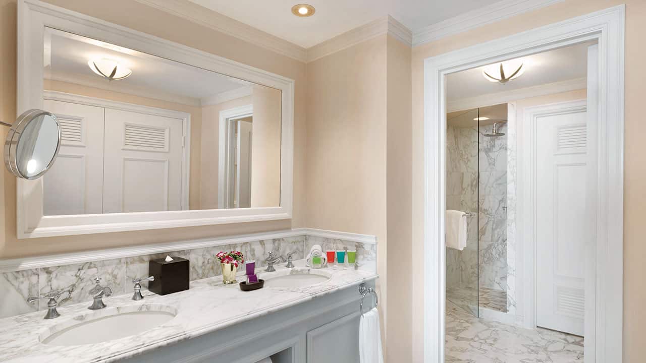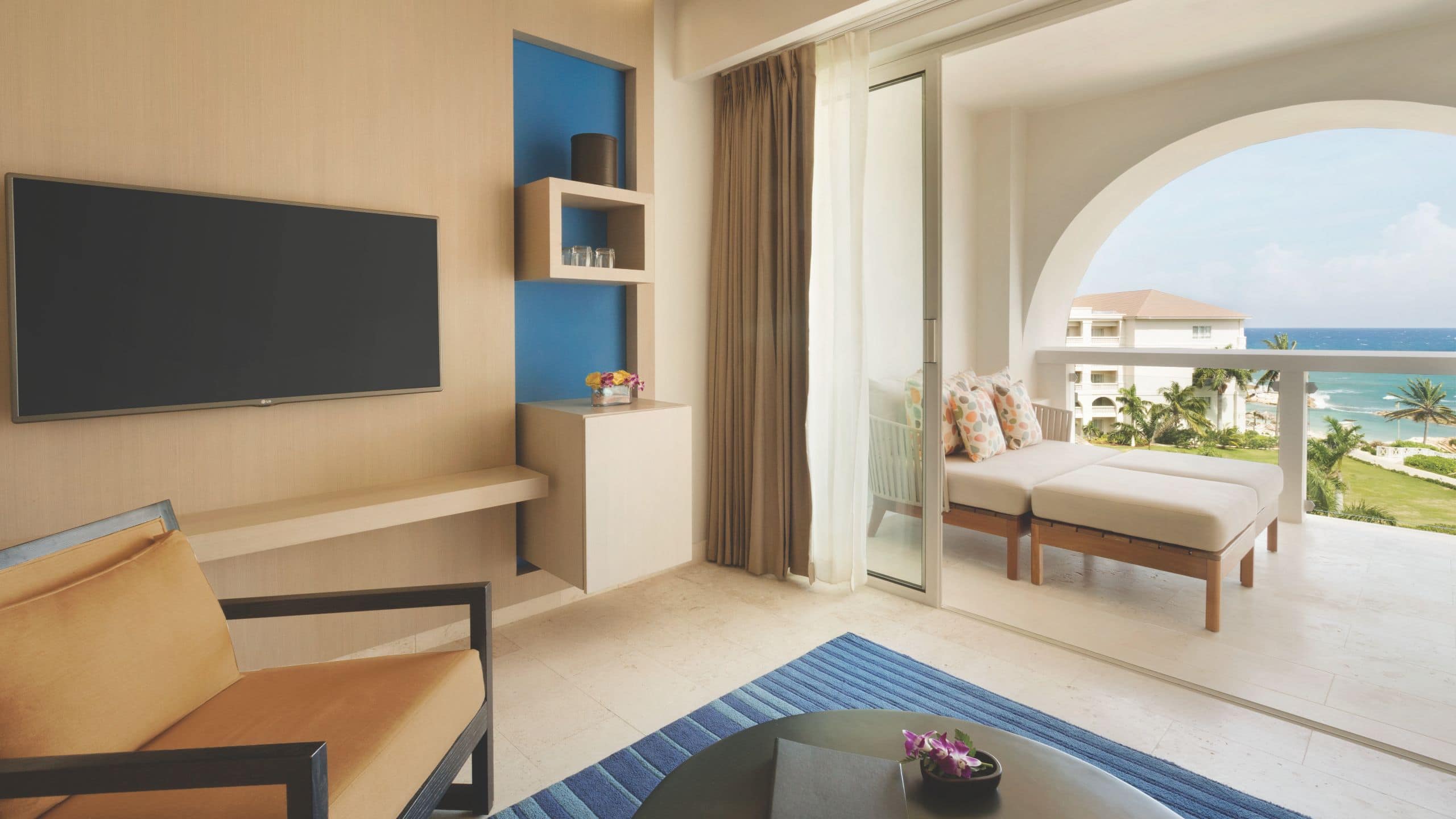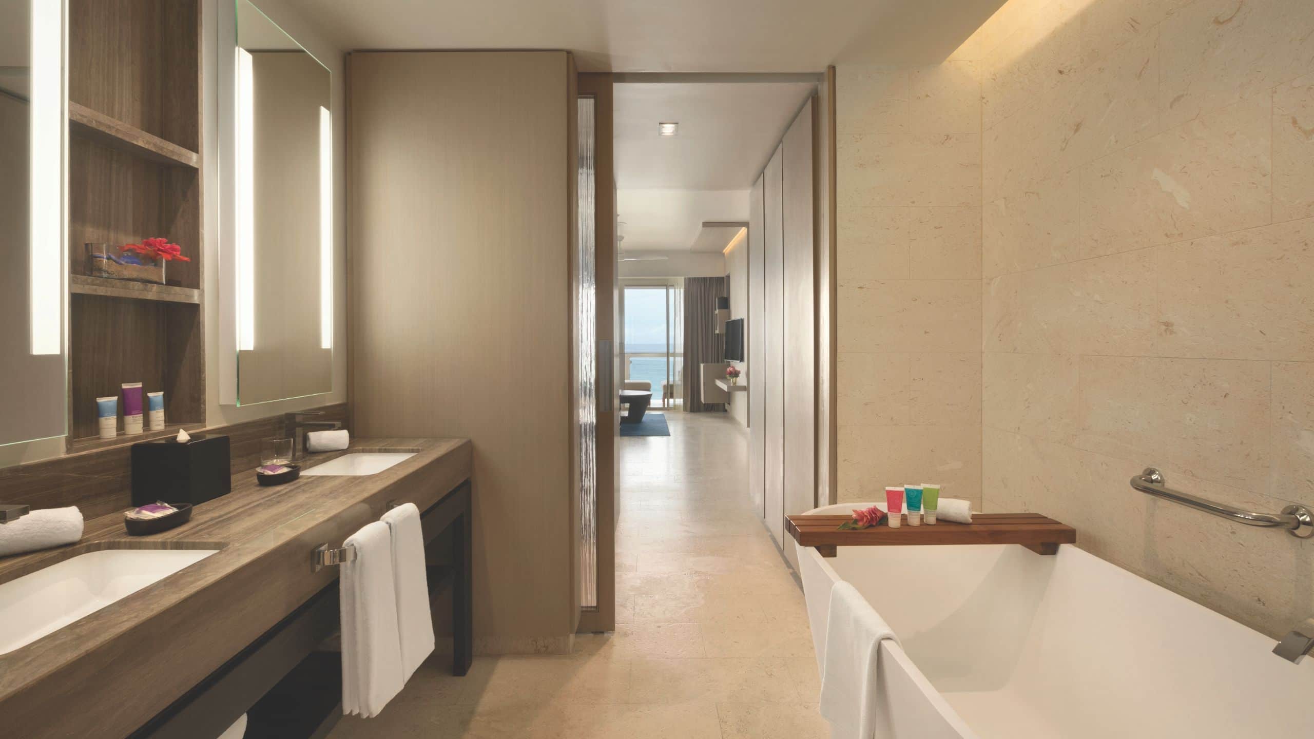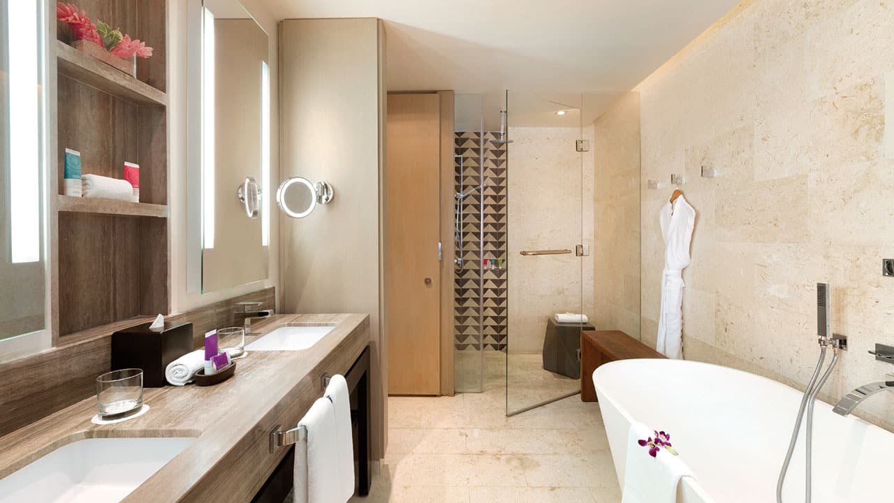 The 1,083-square-foot suite features one king bed and a sofa bed in a separate living room, two full bathrooms, a rainfall shower and separate tub, butler service, and direct views of the Caribbean Sea. This is a premium suite. See World of Hyatt program terms for upgrade eligibility.