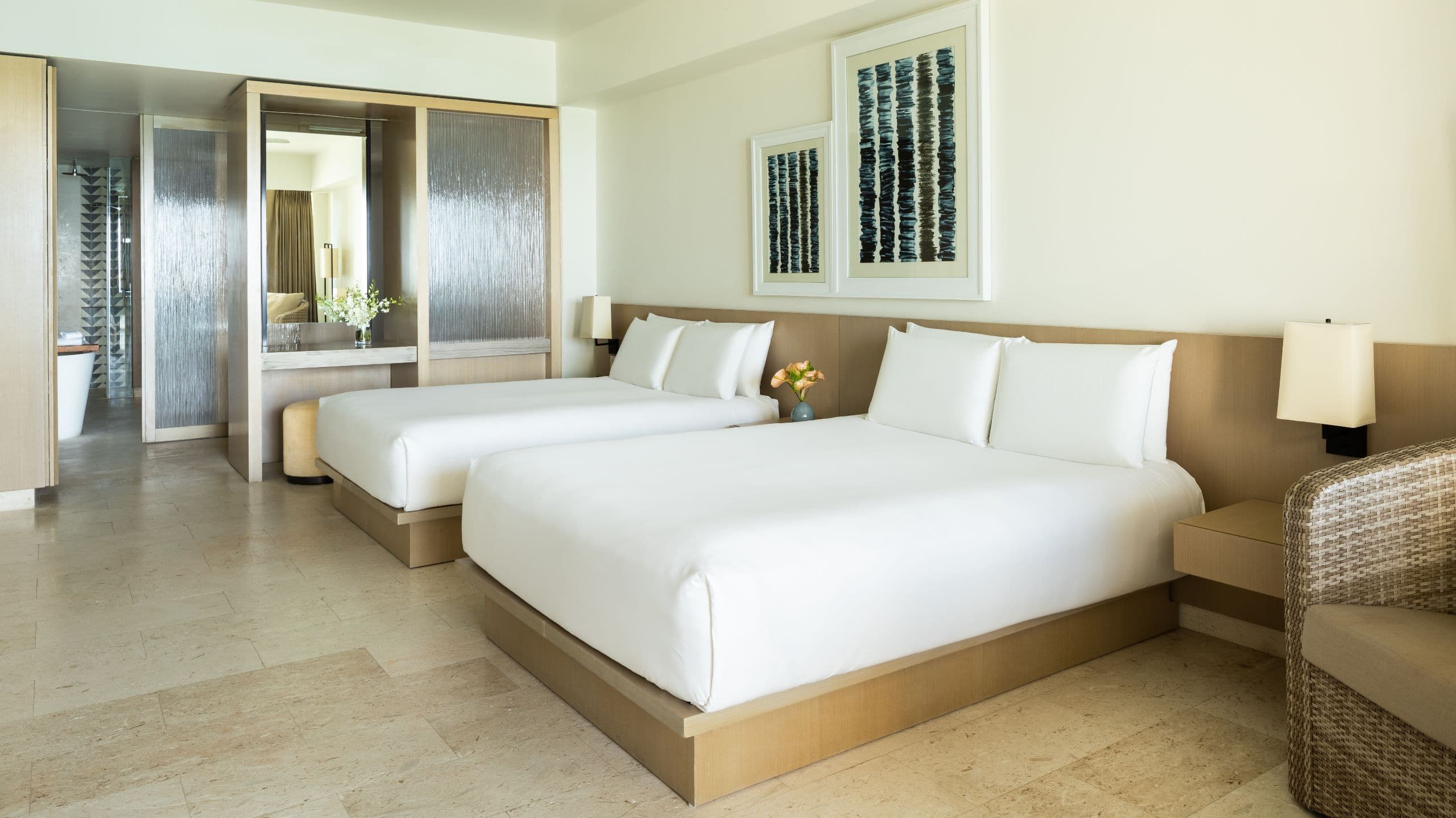 This elegant 656-square-foot suite features two queen beds, a rainfall shower and separate tub, and a terrace with views of the ocean. This is a standard suite. See World of Hyatt program terms for upgrade eligibility