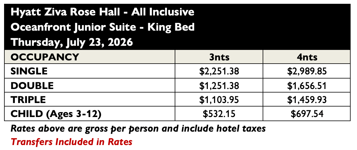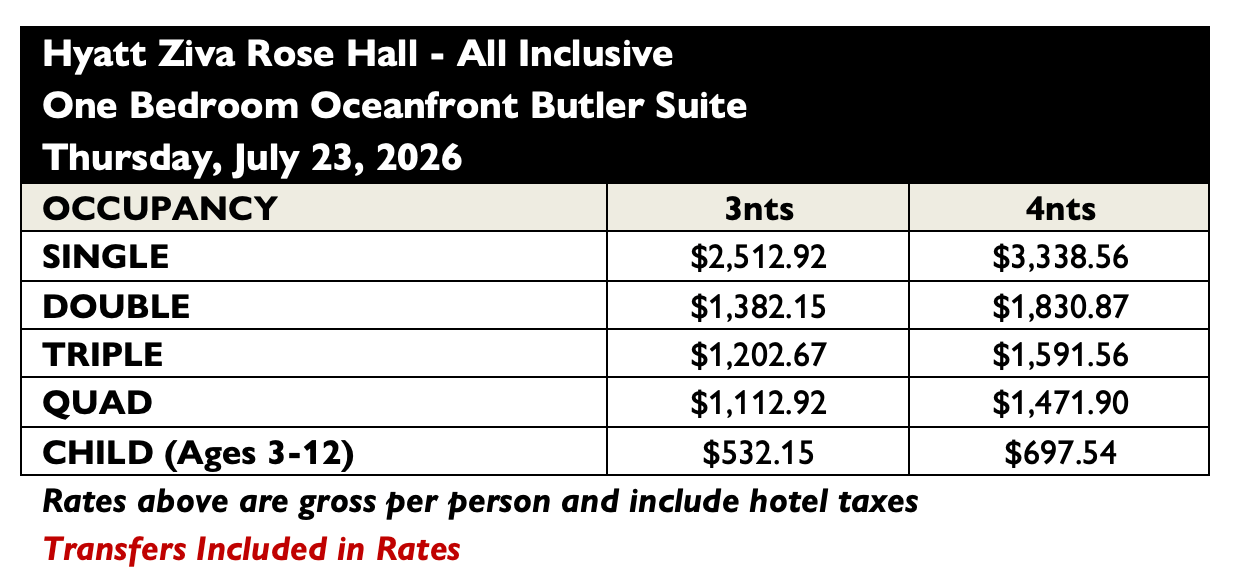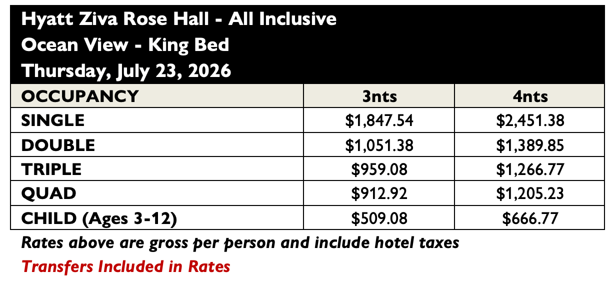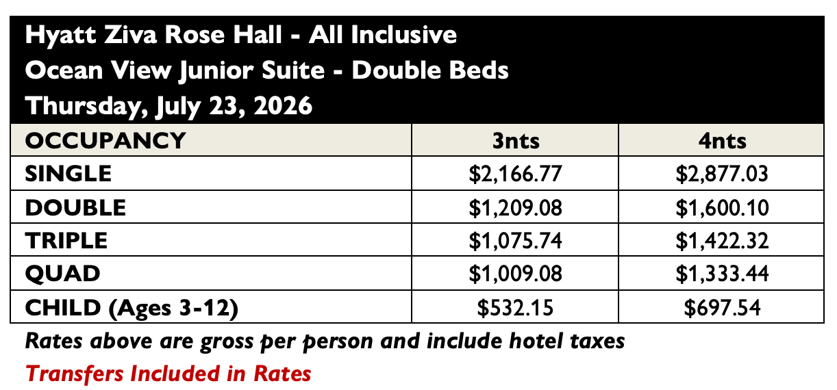 - Round-trip transfers between the Montego Bay International Airport and Hyatt Ziva Rose Hall
